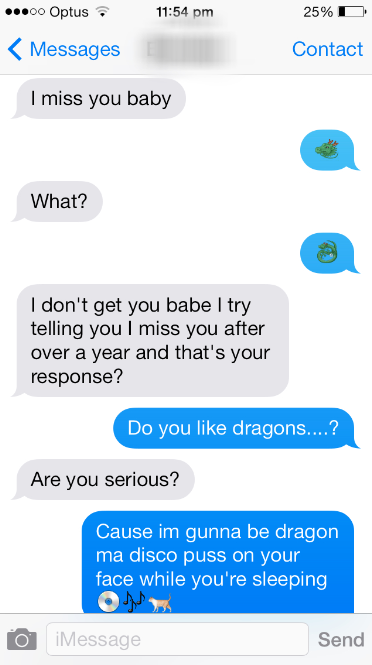 First I send a dragon head. He responds immediately with 'can I call you?' For someone who usually takes an hour to reply this is a good sign. After much consideration I decided to pull out the big guns and really make him work for it * Dragon Body * he starts typing instantly and it's obvious that The Dragon has worked its mythical magic and he wants me again.